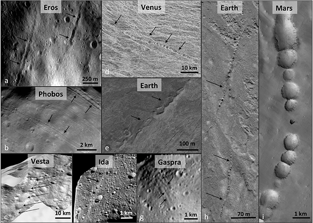 2017年,美国研究人员发表了卡西尼任务,他们声称的高分辨率图像显示地质结构称为坑链点土卫二的表面。排除影响和其他各种地质活动后,行星科学家们得出结论,圆形和椭圆形坑形成骨折在地壳下松散堆积的风化层延伸和扩大。