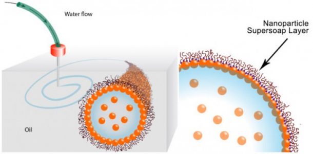 注入打印机的水被注入了金纳米颗粒。分散的聚合物配体也加入到油中。配体基本上是与金属原子结合的一组原子。当金斑点的水和聚合物污染的油结合在一起时,配体被拉并与金纳米颗粒结合。其结果是在水周围覆盖了一层纳米颗粒,阻止水破裂成水滴。