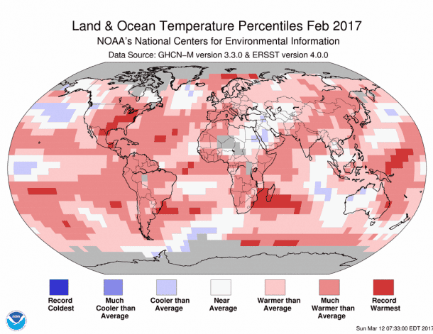 NOAA和NASA的科学家也得出结论,人类活动是导致气温上升的主要原因,这是包括美国总统在内的否认气候变化的人所忽视的事实。即使反气候变化阵营在某种程度上伪造了数据,他们也不能否认,2017年2月,美国人遭遇了一系列创纪录的高温,一场前所未有的热浪席卷全国。世界上许多其他地区也出现了类似的趋势。