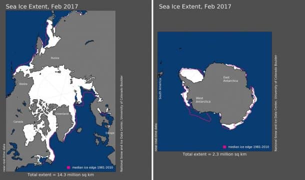 高温也给地球上的海冰带来了灾难。据美国国家海洋和大气管理局报告,北极和南极记录了自1979年开始有卫星记录以来最小的2月份海冰质量,南极的平均海冰质量比1981-2010年2月份的平均水平低24.4%。在北极地区,冰的范围比平均水平低7.6%。