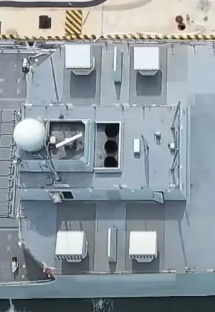 上层建筑设有四个726型防御发射器。Nanchang的照片显示了两侧的两个船尾上层结构的两侧。这些24细胞发射器可能会发射耀斑,配备有微小的射频干扰物,带有少量深度电荷的反海洋火箭以及含有雷达盲冰棍的墨盒。