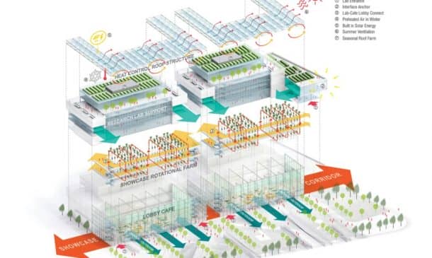 该综合大楼完成后,还将为游览互动温室的游客开放,观看独特的水培养系统,并惊叹于将拥有各种绿色技术的科学博物馆。