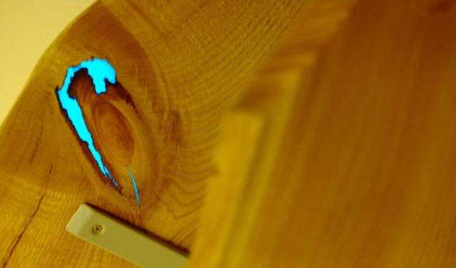 他将一些在黑暗中发光的粉末与树脂混合,倒入后等了3天。结果是壮观的货架只有一点颜色。货架在白天看起来像普通的货架,然而,当夜幕降临,树脂开始发光,赋予相当宏伟的外观的货架。