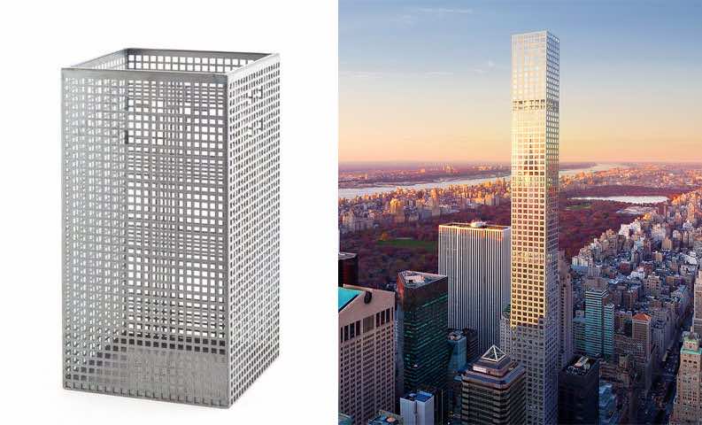 425.5米高的塔楼(1,396英尺)塔由10平方米(110平方英尺)的窗户定义for the building’s 104 luxury residences. According to the architect, the form of the building is directly inspired by the design of a wastebasket, specifically one designed by Josef Hoffman. This creates an interesting dichotomy between the utilitarian inspiration of the design and the ultra luxurious elements in its execution and purpose.