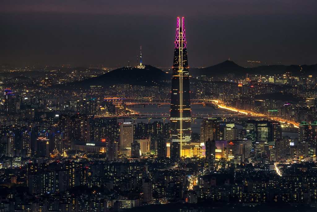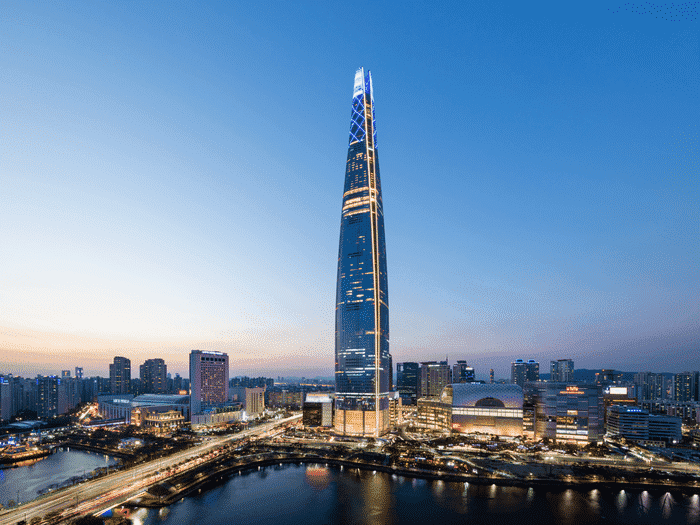 乐天世界大厦是首尔天际线上的皇冠明珠,目前是世界第五高的建筑。这座超高层建筑于2017年对外开放,从底部到建筑顶部的总高度为555.7米。在众多功能中,该大厦是乐天集团的总部所在地,乐天集团的子公司建造了该大厦。这座123层的高楼是首尔城市景观的地标。