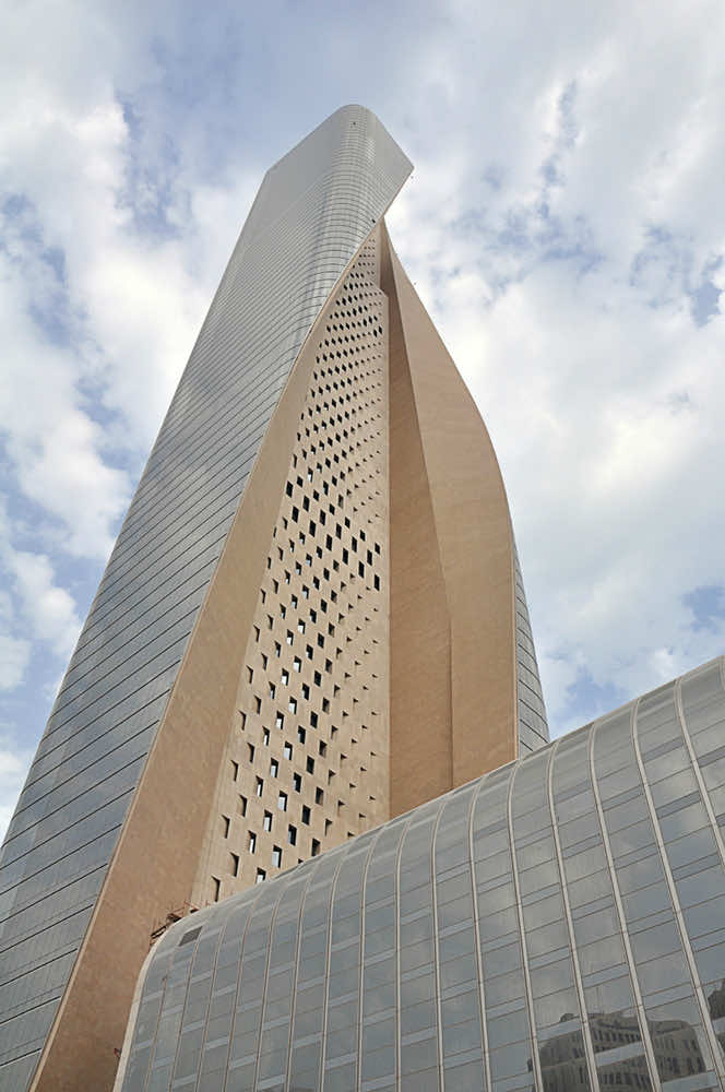 由Skidmore,Owings和Merril设计的塔楼设计对该地点的气候现实以及塔的性能驱动形式表现出了极大的关注,这是由于这种关注的结果。加上最大化视图的愿望,启发了建筑物的不对称形状,这呼唤了科威特斯穿着的传统长袍。Al Hamra Tower的个人资料使其与其他高层建筑区分开来,象征着科威特在全球商业行业的新兴领导力。它的雕塑形式本质上是一种被动的太阳能保护策略。面对设计残酷的太阳暴露,设计师选择从科威特的极端沙漠条件中汲取灵感,而不是承认其约束,即使不是有害的效果。Al Hamra塔的不对称形式是通过简单的去除操作而产生的。在太阳能分析的情况下,SOM从南立面移走了四分之一的地板,在塔的西南角启动,并在其高度上逆时针旋转。这消除了满足该项目的编程要求的同时:25,000平方英尺的地板板,40英尺租赁跨度和270°的水景观。一个24米高的大厅是塔楼的主要入口。它将建筑服务连接到城市的基础设施,并有助于结构的僵化。