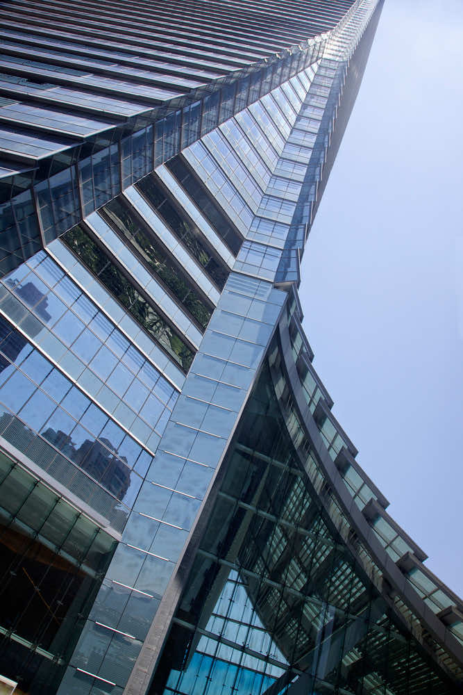 该建筑物由顶部附近的5星级酒店组成,在整个摩天大楼的其余部分都在基地和办公室空间组成。该建筑物的地面上方有108层,地面下方有4层。由于香港四恐惧症的患病率,省略了数字“ 4”(4、14、24等)的地板。因此,它被销售为118层的建筑。国际建筑公司科恩·佩德森·福克斯(Kohn Pederson Fox)赢得了为建筑物设计而举行的比赛,但是最初的设计必须经过几次重新设计才能达到最终结果。该设计的初稿是基于圆形平面图,因为它最大程度地减少了风载荷,但平面图在使用空间方面并不有效。平方平面图在使用该区域方面运作良好,但在防风和结构稳定性方面表现出色。因此,通过风洞研究并通过引入缺口或“重点”角对方形计划进行稍作修改,该结构能够执行与原始圆形计划相似的。