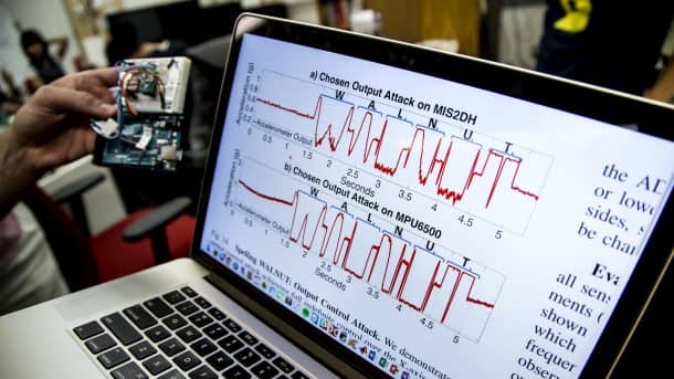 该团队使用了来自五家不同制造商的20个不同的加速计,并用恶意音乐文件对它们进行轰炸。研究人员设法用共振频率欺骗传感器来完成各种任务。密歇根大学副教授凯文·傅(Kevin Fu)说:“这就像歌剧演员敲击音符打破酒杯一样,只是在我们的情况下,我们可以拼写单词(并向智能手机发送命令)。你可以把它想象成一种音乐病毒。”