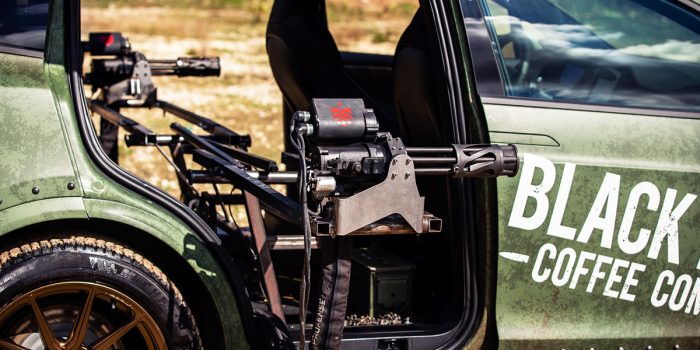 黑色步枪咖啡公司和常驻机械天才的联合创始人理查德·瑞安(Richard Ryan)于2018年创建了普锐斯·瓦肯(Prius Vulcan),他知道下一步是将令人难以置信的火力倒入凉爽的汽车中,特斯拉型号X。。他着手为X Model X EV配备可部署的机翼,从后门延伸,每个机翼都配备了5.56旋转机枪,每分钟能够发射数千发子弹。此外,汽车必须在背面具有功能齐全的高端浓缩咖啡棒。