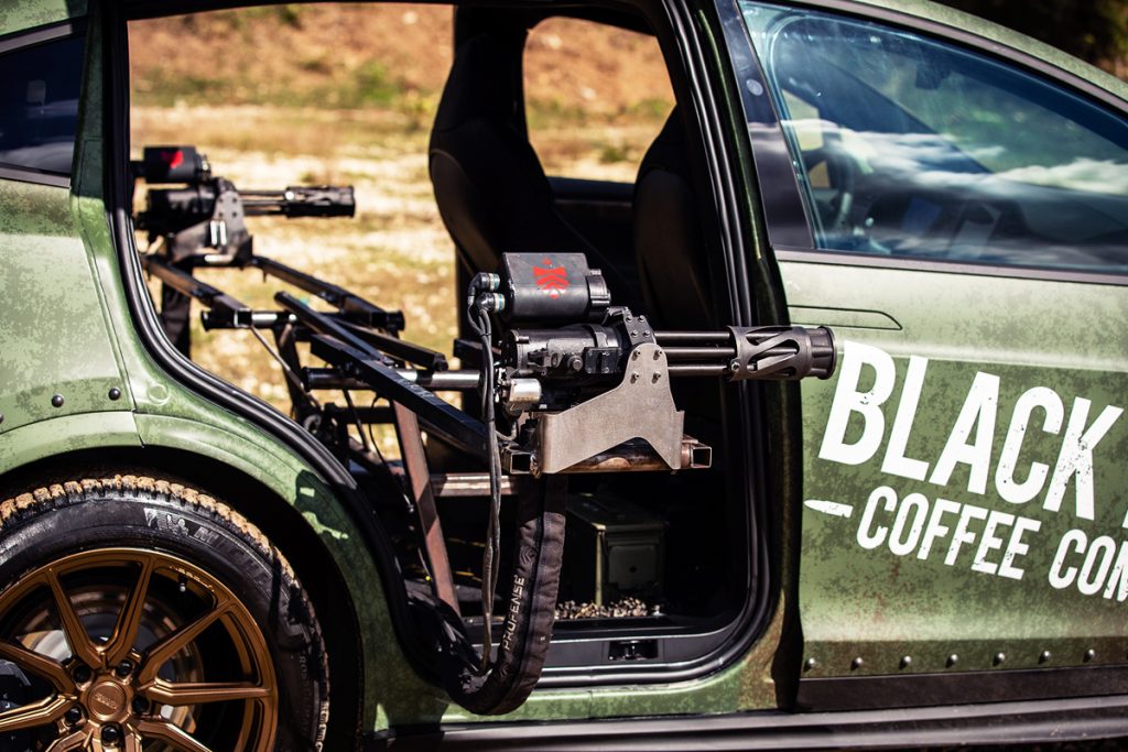 黑色步枪咖啡公司和常驻机械天才的联合创始人理查德·瑞安(Richard Ryan)于2018年创建了普锐斯·瓦肯(Prius Vulcan),他知道下一步是将令人难以置信的火力倒入凉爽的汽车中,特斯拉型号X。。他着手为X Model X EV配备可部署的机翼,从后门延伸,每个机翼都配备了5.56旋转机枪,每分钟能够发射数千发子弹。此外,汽车必须在背面具有功能齐全的高端浓缩咖啡棒。