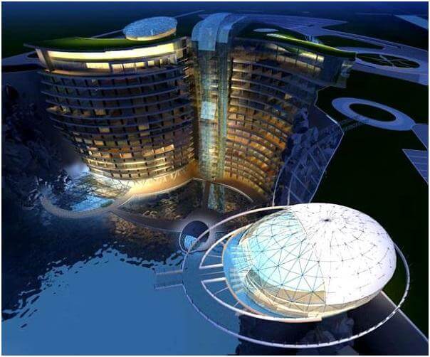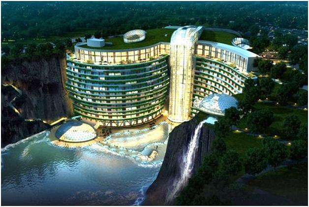 这家豪华酒店的设计包括水下休息室和客房。采石场的水将被用来淹没酒店的某些部分。在美丽的湖泊中给它带来了淹没的大厦。这些图像展示了一个人造瀑布,沿着酒店前部附近的岩石层叠。主休息室以绿色的植被和天然岩石缠绕,将通过阳光照亮。此外,酒店将设有体育设施;它的一些其他功能包括攀岩和蹦极跳,还有一个水族馆将近十米。