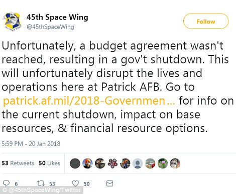 随着国会无法联邦政府基金的日常运作,SpaceX公司不能完成重型猎鹰测试。公司依靠来自NASA肯尼迪航天中心的人员和美国空军太空翼监督操作。只要政府继续关闭,等公司SpaceX是接地。