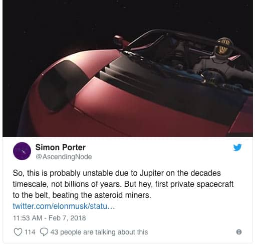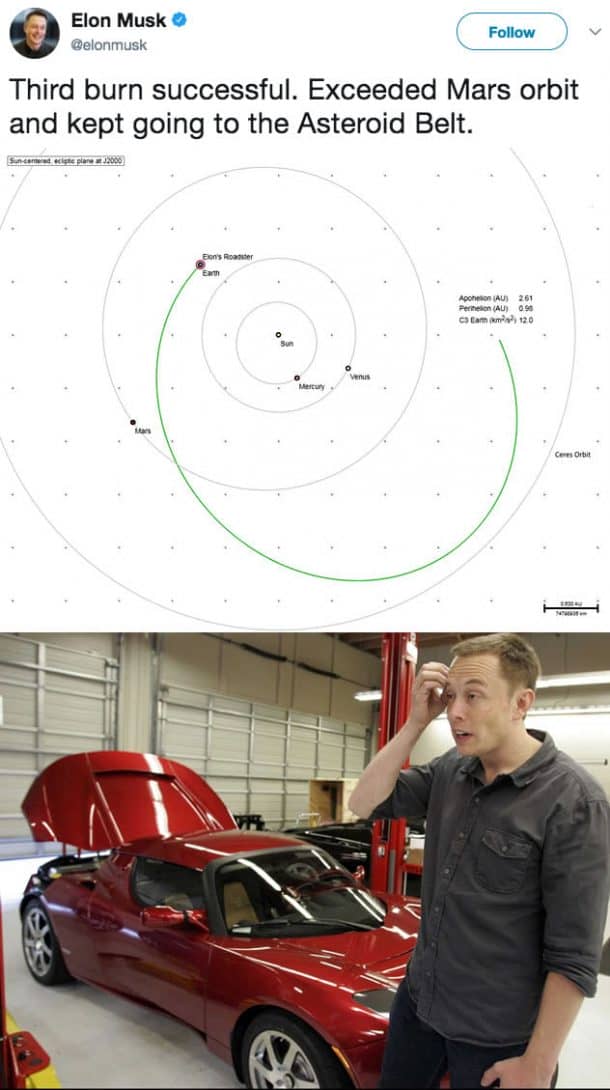 The car was supposed to be shot into the Mars orbit after a six-hour coast in the upper part of the rocket, but the final burn of the rocket was more powerful than anticipated and Starman with his Tesla overshot the orbit and is now heading to the asteroid belt between Mars and Jupiter.