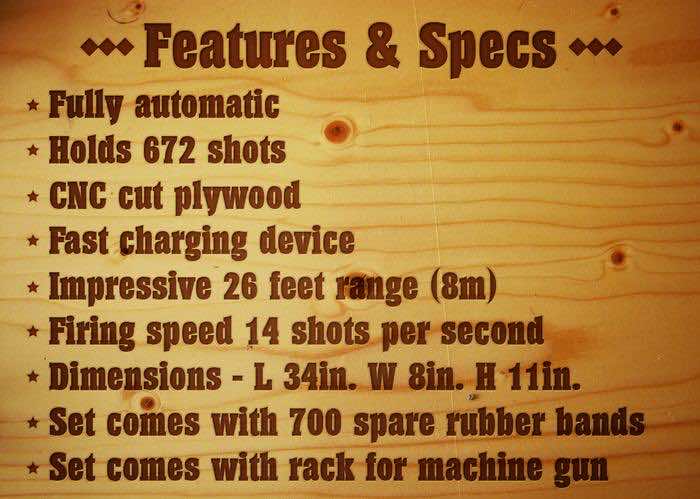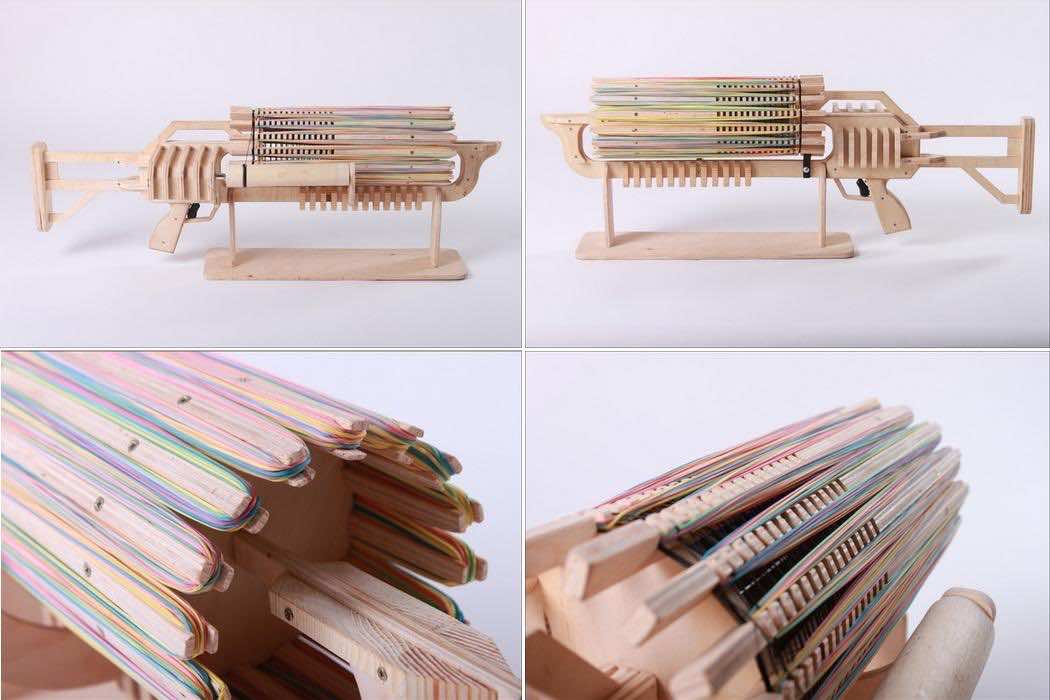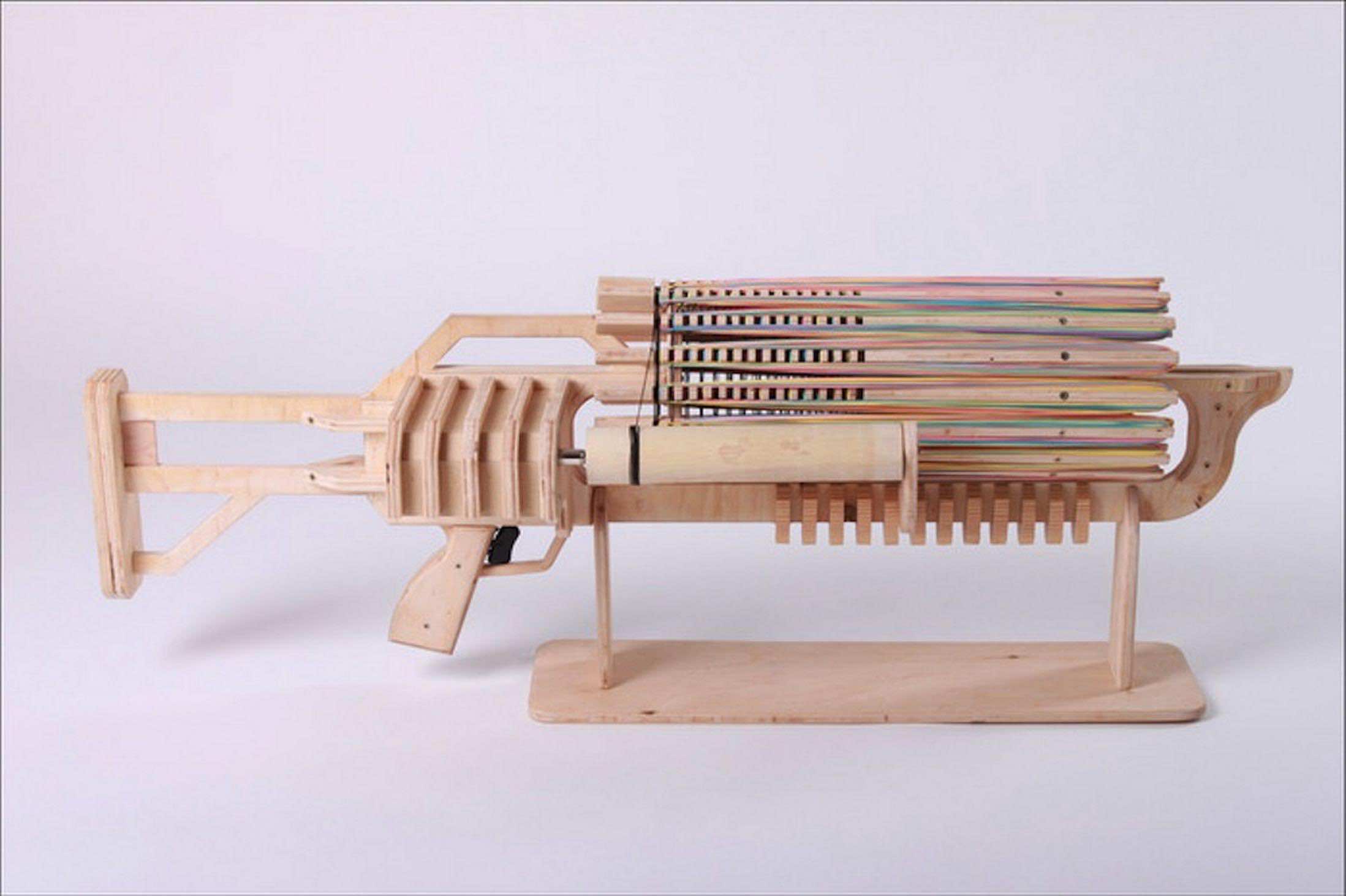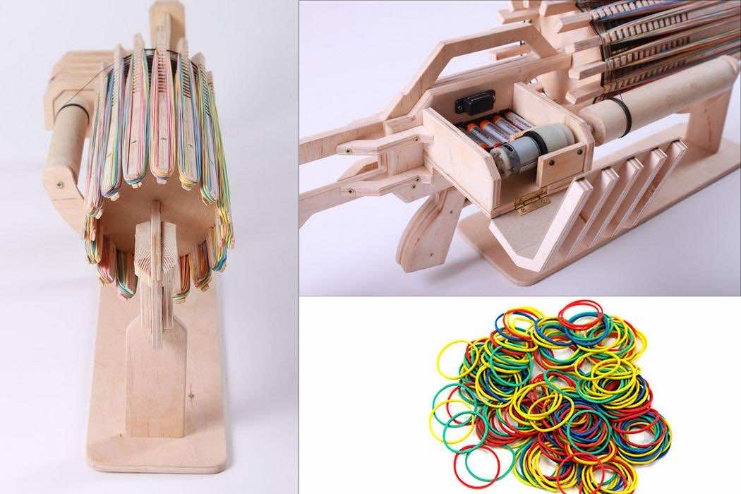 Shpetniy说;“每个人都喜欢有橡皮筋打架的孩子现在各个年龄段的孩子可以享受练习与橡皮筋机枪的射击技能。”他解释说,这枪已经由桦木胶合板和使用计算机数控(CNC),这是减少。枪有三种颜色;燃烧木材、原始桦树和黑色。他说,”和我的橡胶带枪机每个人都能感觉蓝博,启动一个橡胶风暴,和投掷一磅橡皮筋对他们的对手。我有工作经验和木头所以我很快着手制作第一个原型。字符串是伤到鼓上,通过削减桶,然后橡皮筋拉伸的字符串。字符串的电动卷拉橡皮筋一个接一个,将他们释放到飞行。我花了过去一年发展中枪的最后阶段是发明了“快速充电”这意味着您可以重新加载橡皮筋很快。”