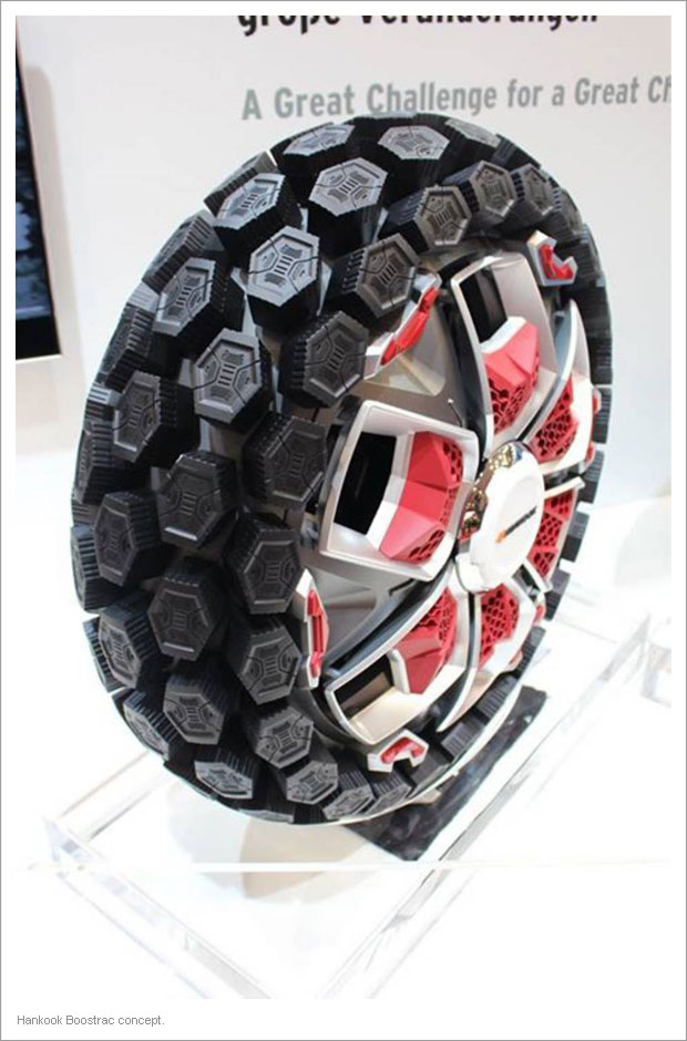 该概念是设计用于达喀尔风格的抵抗比赛的概念。在这场比赛中,需要车辆在越野和越野地形上。该设计利用了能够互锁的六角形块,而不是使用一块连续的橡胶。