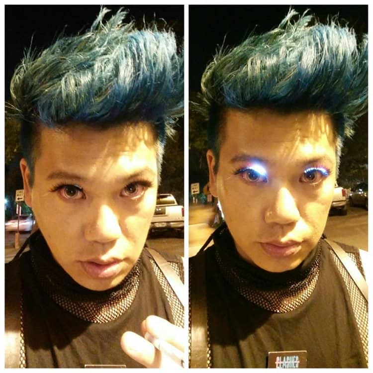 Arduino设计师Tien Pham提出了技术的著名f.lashes;用睫毛胶粘在眼睑上的互动LED睫毛。引人注目的棍棒有粉红色,红色,蓝色,浅蓝色,白色,黄色和绿色,每种都有不同的照明模式。In the ‘follow mode,’ the lights follow the movements of your head, and in the ‘dance mode,’ the lights blink in short intervals whenever you move your body, and the ‘sparkle mode’ individually lights to LEDs to create a sparkle effect.