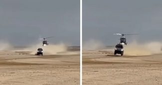 在达喀尔汽车拉力赛上,这架低空飞行的直升机撞上了一辆高速行驶的卡车