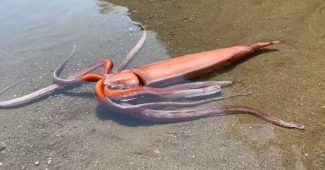 一只大巨大的十英尺巨型鱿鱼在日本西部岸上冲了上岸,对最大的一瞥。