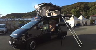 这种新的露营小巴,现代有一个了不起的顶楼阳台