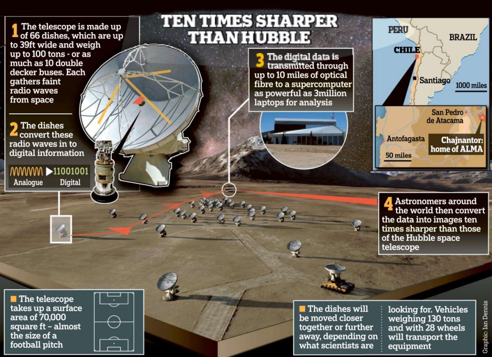 在阿尔玛,它由66个巨大的天线,甚至收集的无线电波,然后由计算机处理。建造这台机器成本£9.5亿,下的概念;寻找我们的宇宙起源。这个想法是为了收集信息关于行星,恒星和宇宙。阿尔玛收集无线电波而非可见光,这使得它甚至能穿透密集的出现在深太空的尘埃云。根据布莱恩·埃里森阿尔玛的英国项目经理说;这是说我们都是由星尘。阿尔玛将回答某些问题我们来自何方。”