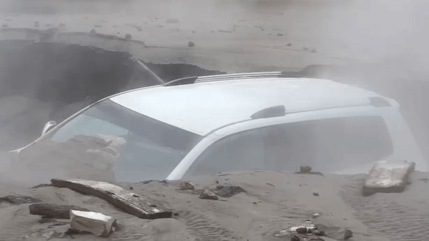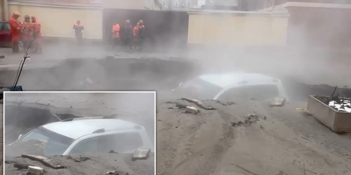 一场可怕的事故发生在圣彼得堡,俄罗斯,当汽车带着两个孩子陷入深坑满了开水。被捕的事件,在视频中,展示了一个白色SUV获得吞噬地面了。