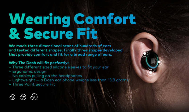 Dash可以被称为可穿戴的双微型计算机,配备了生物传感器、麦克风、活动实时反馈教练、健身追踪器和Dash媒体播放器。Dash耳机通过蓝牙连接在一起,机箱内填充了硅胶,从而提供防水保护。用户只需轻按控制耳机,设备就会通过蓝牙连接播放音乐,或者使用内置MP3播放器(4GB存储/ 1000首歌曲)。该公司声称Dash耳机是“世界上第一个完全无线的智能耳机系统,提供了自由的运动,最大的舒适性和惊人的声音——所有这些都可以通过声音指导,跟踪运动和捕捉关键的生物特征数据。”