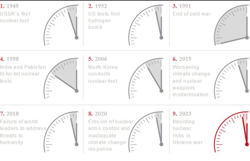 具有隐喻意义的“末日时钟”(Doomsday Clock)——一种用来象征人类离灭绝有多近的设计工具——已经接近午夜,这意味着核战争和其他威胁地球生命的灾难的风险加大。基本上,这主要是俄罗斯入侵乌克兰的结果。
