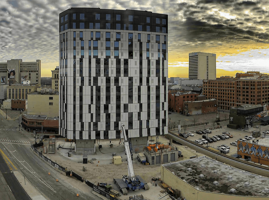 LiftBuild,巴顿Malow的全资子公司,使最终floorplate交易所建设在底特律市中心Greektown社区,覆盖14个总floorplate电梯加上屋顶板。