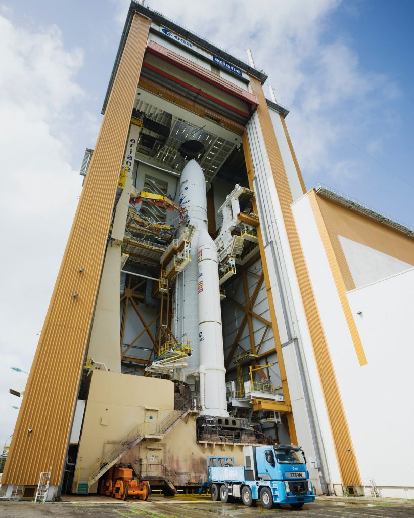 Ariane 5火箭在发射台上高高地位,JWST藏在Nosecone中。天空是有雾的,但以前被认为是发射延迟的原因的天气似乎现在还不错。