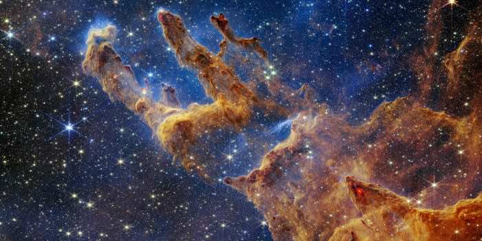 詹姆斯·韦伯太空望远镜已经将它的红外眼睛转向了那些躺在尘埃摇篮里的新生恒星,它们创造了一个被称为“创造之柱”的宇宙景观。在周三公布的新柱子图像中,樱桃红色的条纹和波浪是由气体和尘埃(微小的原恒星)挤压而成的物质喷流,它们正朝着恒星的方向移动。