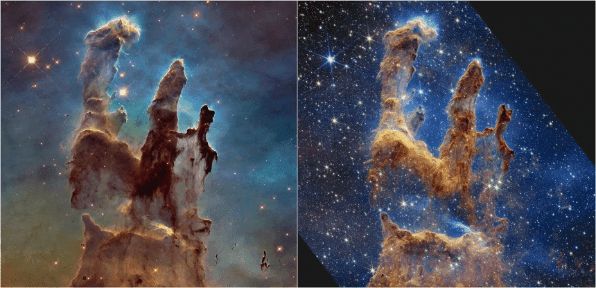 韦伯的前任哈勃太空望远镜在1995年提供了创世之柱的照片这吸引了太空爱好者。2014年,哈勃望远镜回到了著名的巨柱,拍摄了一张清晰得多的图像。