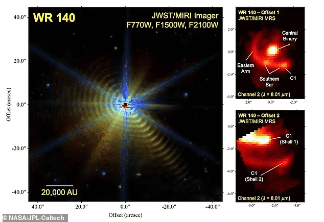 加上这一点,这颗恒星和它的伴星被统称为“沃尔夫-拉耶特140 (WR 140)”,距离地球约5000光年。此外,国家科学基金会NOIRLab的天文学家Ryan Lau说:“我们正在研究这个系统一个多世纪以来产生的尘埃。该图像还说明了JWST是多么敏感。以前,我们只能通过地面望远镜看到两个尘埃环。现在我们至少看到了17个。”