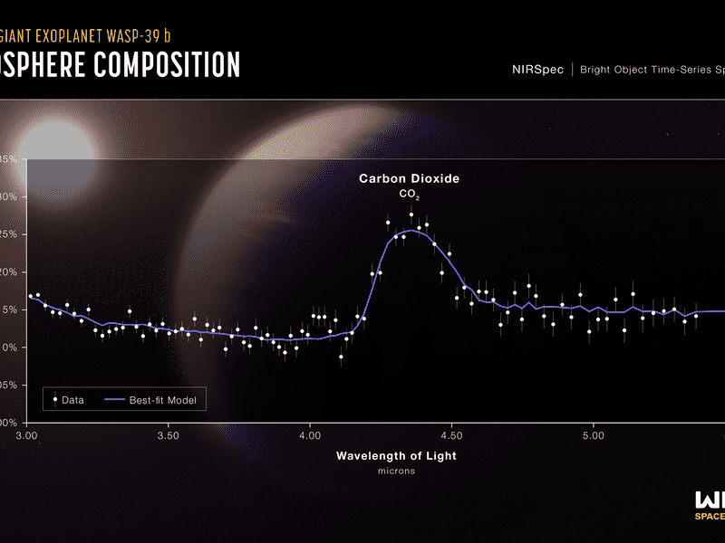 该方法名为NIRSpec,旨在使用过滤过的星光来记录在这颗系外行星表面发现的二氧化碳证据碎片。然而,研究人员可以很容易地通过波长光谱调整亮度的差异。通过这个过程,他们可以很容易地确定最终使他们能够探测到二氧化碳的大气结构。约翰霍普金斯大学研究生、JWST凌日系外行星社区早期发布科学团队成员、同时也是调查团队成员的Zafar Rustamkulov说:“数据一出现在我的屏幕上,巨大的二氧化碳特征就抓住了我。这是一个特殊的时刻,跨越了系外行星科学的一个重要门槛。”