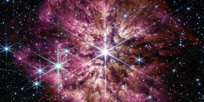 随着排出气体远离恒星,它冷却,凝结成一个发光的“星云”发出粉红色光芒,可见红外摄像机的韦伯望远镜。这些抛射作为一个信号,表明恒星正在接近其最终爆炸行动,超新星。