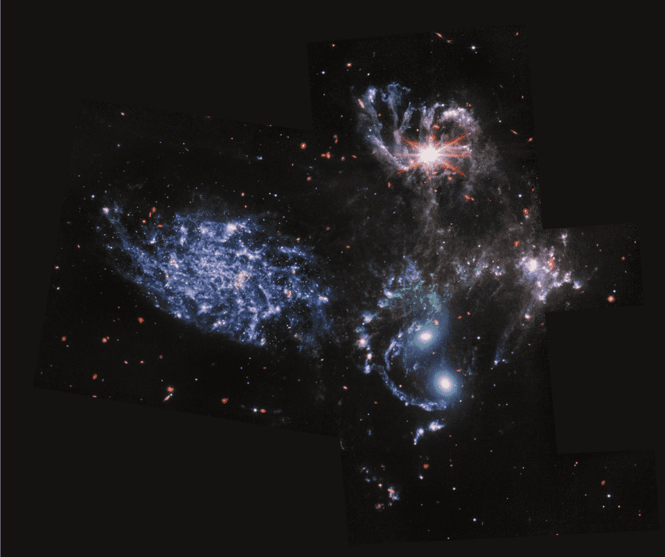 詹姆斯·韦伯(James Webb)望远镜共享的图像是数百万年轻恒星的闪闪发光群,以及由于引力相互作用而从几个星系中拉出的燃气尘和恒星的巨大尾巴。