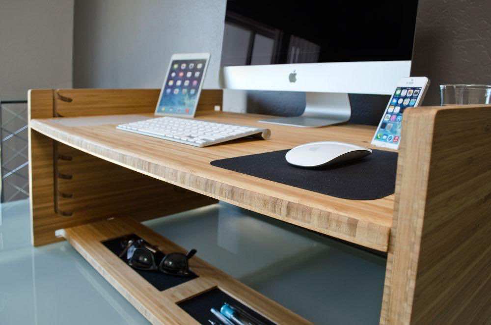 升降机是由一家名为Iskelter的公司创建的,是您现有办公桌的附加单元。它的尺寸为37英寸,深度为22.5英寸,高度为16.2英寸,并带有可调节的架子,由于带有凹口的侧面板,它的范围为3到15英寸。它具有自然色,榛子和竹子。底部的架子上盖有毛毡材料,您可以将笔,钥匙或硬币放在那儿。在个性化方面,电梯很棒。
