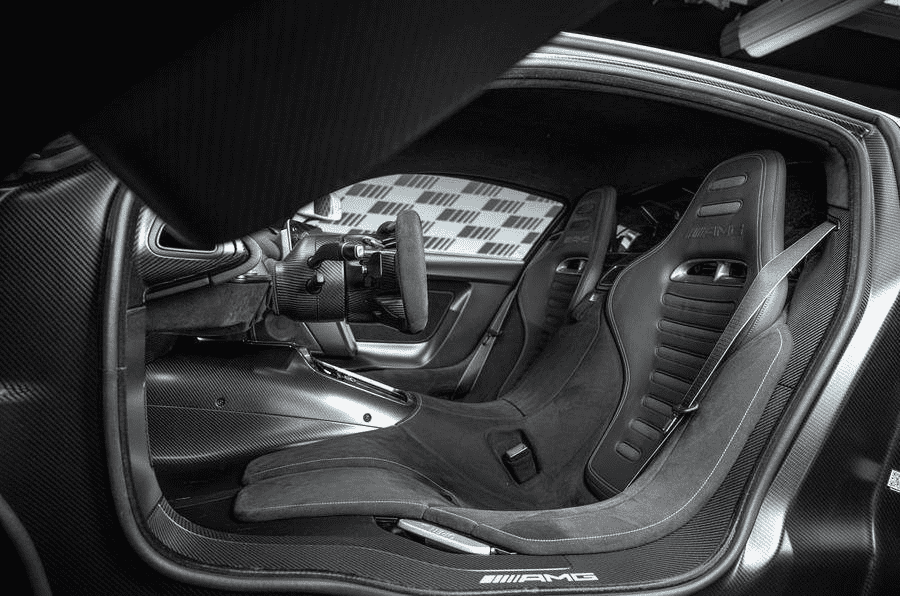 内部的最新奔驰AMG完成之一的混合合成皮革和碳纤维。苗条的座位鸽直接安装到车架的地板,降低司机和乘客一个倾斜的位置和他们的膝盖低于他们的脚。
