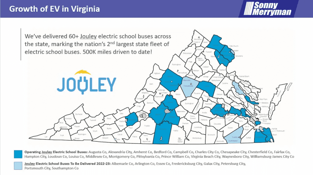 弗吉尼亚州目前有64辆电动公交车。前50辆由多米尼恩能源公司购买并部署,其余14辆由美国电力公司电动校车项目提供资金。