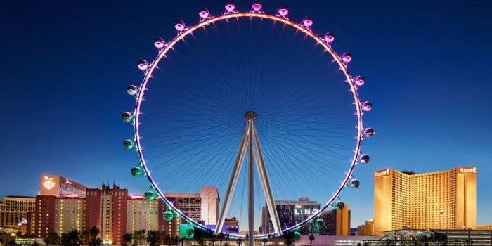 “High Roller”是一座高550英尺(167.6米)、直径520英尺(158.5米)的巨型摩天轮,最近被称为“观景轮”,位于美国内华达州天堂的拉斯维加斯大道上。它于2014年3月开放,是目前世界上最高的摩天轮。