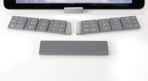 大约是1/3路与iPhone相比,尺寸的尺寸仍然设法在仅包含8个实体键的组件上填充完整的Qwerty布局。它由4个零件组成,它们可以组合在一起,以创建一个可用于存储和运输的块。有一个支架和一个空间键以及两个包含按钮的键盘。空格键和两个键盘两半磁性地连接起来,可以通过蓝牙4.0与手机或平板电脑系在一起。