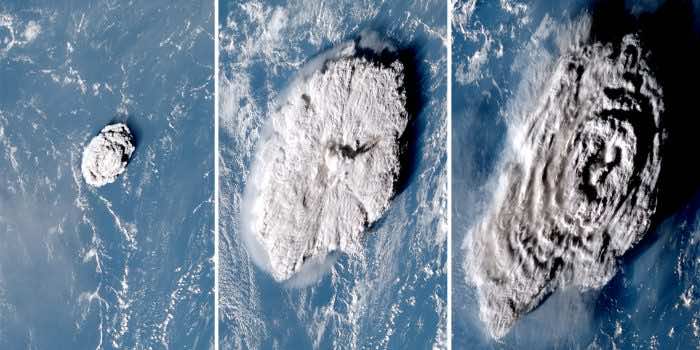 汤加火山在10分钟、50分钟和100分钟后产生了比哈利法塔高68倍的羽流。