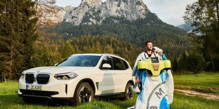 经过在宝马工厂、斯德哥尔摩风洞的细致测试和几次实际跳伞后,是时候公开跳伞了。最初的决定是跳过韩国釜山的三座摩天大楼;然而,由于COVID-19大流行,举办地转移到了奥地利阿尔卑斯山风景更如画的Hohe Tauern山脉。萨尔兹曼和一组穿着普通西装的特技演员从10000英尺的高空跳下直升机。
