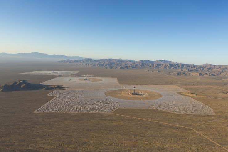 为了让你了解这个项目有多大,这个工厂占地5.5平方英里,是地球上最大的工厂。该系统将产生美国全部太阳能热能的30%。有三个459英尺高的塔,周围有30多万面镜子,每面都有车库门那么大。镜子将阳光聚焦到每座塔顶部的巨型锅炉上。镜子产生的热量非常集中,可以将水煮沸并将其转化为蒸汽,用于驱动涡轮机发电。