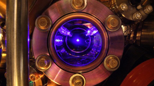 锶晶格钟利用了数千个锶原子,这些原子被激光光学陷阱固定在一个柱中。当原子沐浴在高度稳定的激光(红色)中时,科学家们检测到时钟的滴答声。激光的精确频率触发了原子能级之间的转换。一秒钟有430万亿次滴答声,这应该能说明这个钟有多精确。