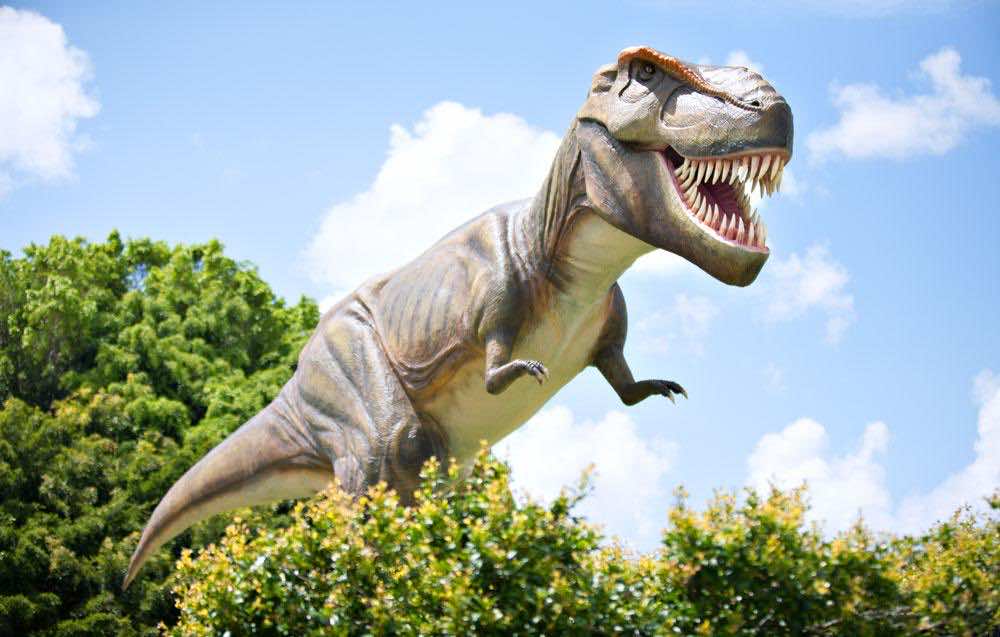 这些恐龙的专业术语是电子动画,这些恐龙能够移动,眨眼,咆哮,是恐龙,看起来超级酷。这些恐龙不仅仅是模型;它们的长度从8英尺到72英尺不等,其中一些约33英尺高。它们包括著名的雷克斯暴龙、迅猛龙、三角龙和腕龙,以及一些不太受重视和著名的恐龙,如长齿龙和甲龙。你还可以看到翼手龙在天空中翱翔。