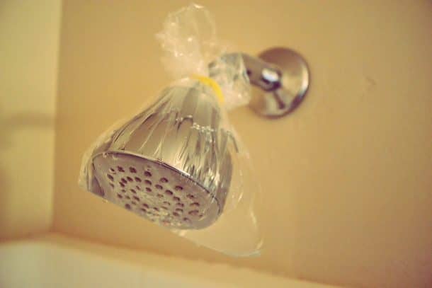 如果您不能将塑料袋绑在淋浴喷头上,则可以轻松拧紧淋浴喷头。淋浴喷头应在醋中浸泡过夜。早晨冲洗并拧回。