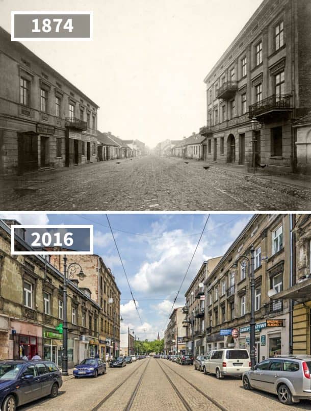 17所示。在波兰罗兹Nowomiejska街,看起来完全抛弃了1874年,但现在看起来像一个正常的繁忙的街道在任何城市如你所愿。