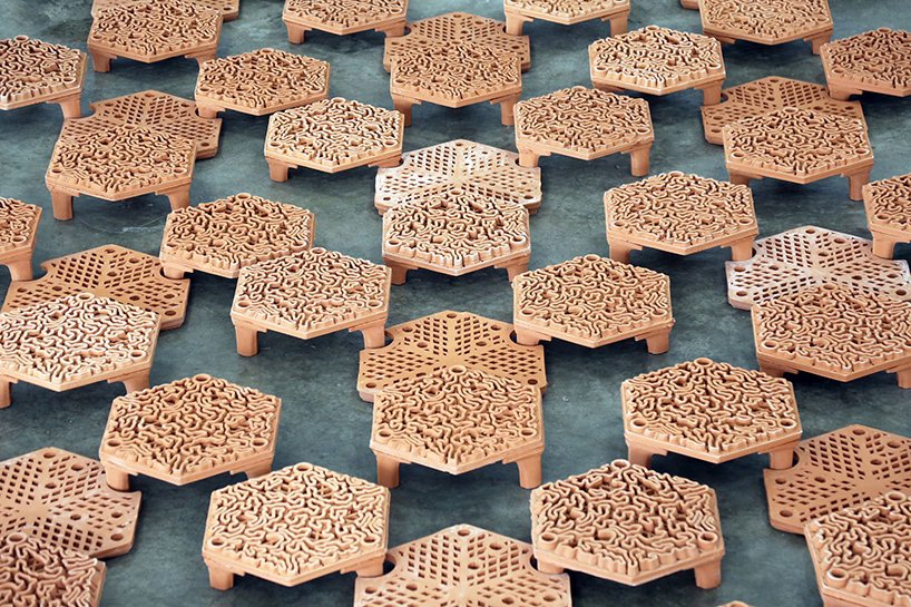 瓷砖用机器人是3 d打印的传统terracotta的粘土,在第二步中,通过在一个炉加热过程的温度1125ºC(2057ºF)。这些新瓷砖测量60厘米(23.6英寸)。