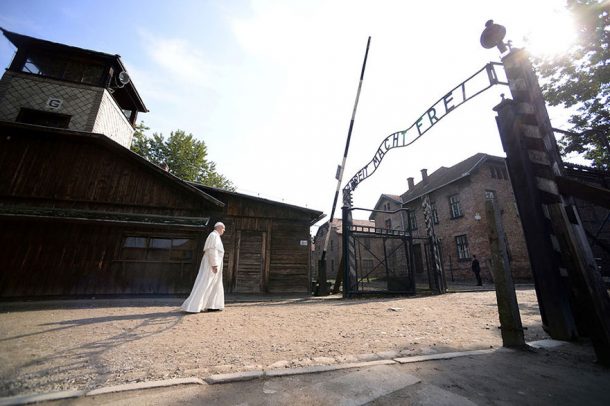 教皇方济各访问了波兰的一个纳粹死亡营,并于2016年7月29日走过奥斯威辛集中营的臭名昭著的大门,上面标有“ Arbeit Macht Frei”(Work Sether You Free)。