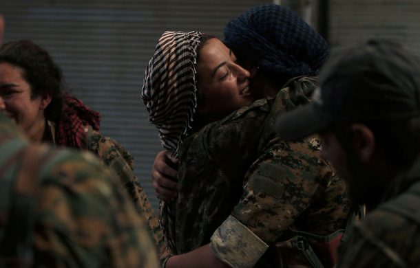 叙利亚民主力量(SDF)的女战士庆祝曼比吉市的胜利,叙利亚,叙利亚,叙利亚,2016年8月10日。
